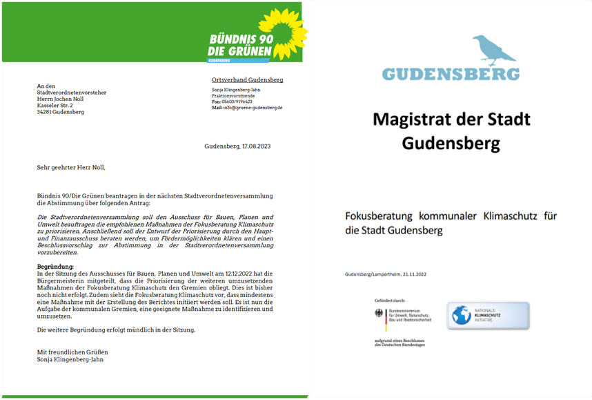 Deswegen freut sich die Fraktion der Grünen Gudensberg, dass unser Antrag gestern parteiübergreifend Zustimmung fand. Wir können jetzt gemeinsam in den Ausschüssen daran arbeiten, die Priorisierung voranzutreiben, Fördermöglichkeiten zu klären, Haushaltsmittel zu planen und schließlich einen Beschlussvorschlag zur Abstimmung für die Stadtverordnetenversammlung vorzubereiten. Nehmen Sie als Bürger aber auch die Gelegenheit wahr, um einen positiven Unterschied zu machen. Unterstützen Sie uns mit Impulsen und setzen Sie sich aktiv für die Verbesserung und Nachhaltigkeit unserer städtischen Infrastruktur und Umwelt ein.