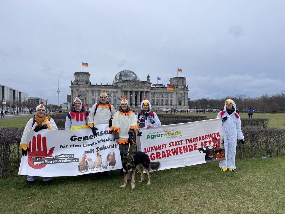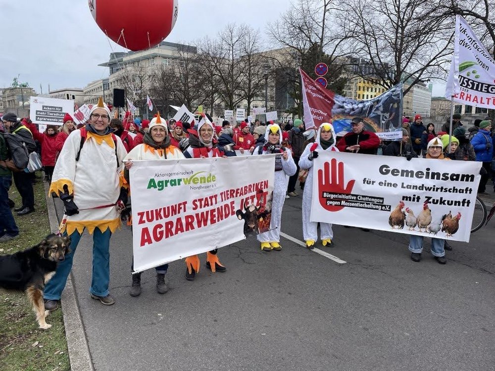 Aktivist*innen aus dem Schwalm-Eder-Kreis und dem Kreis Waldeck-Frankenberg waren am 21. Januar 2022 mit dabei auf der Demo in Berlin, die alljährlich parallel zur Grünen Messe stattfindet und auf die katastrophalen Auswirkungen einer Masse-statt-Klasse Agrarpolitik hinweist.